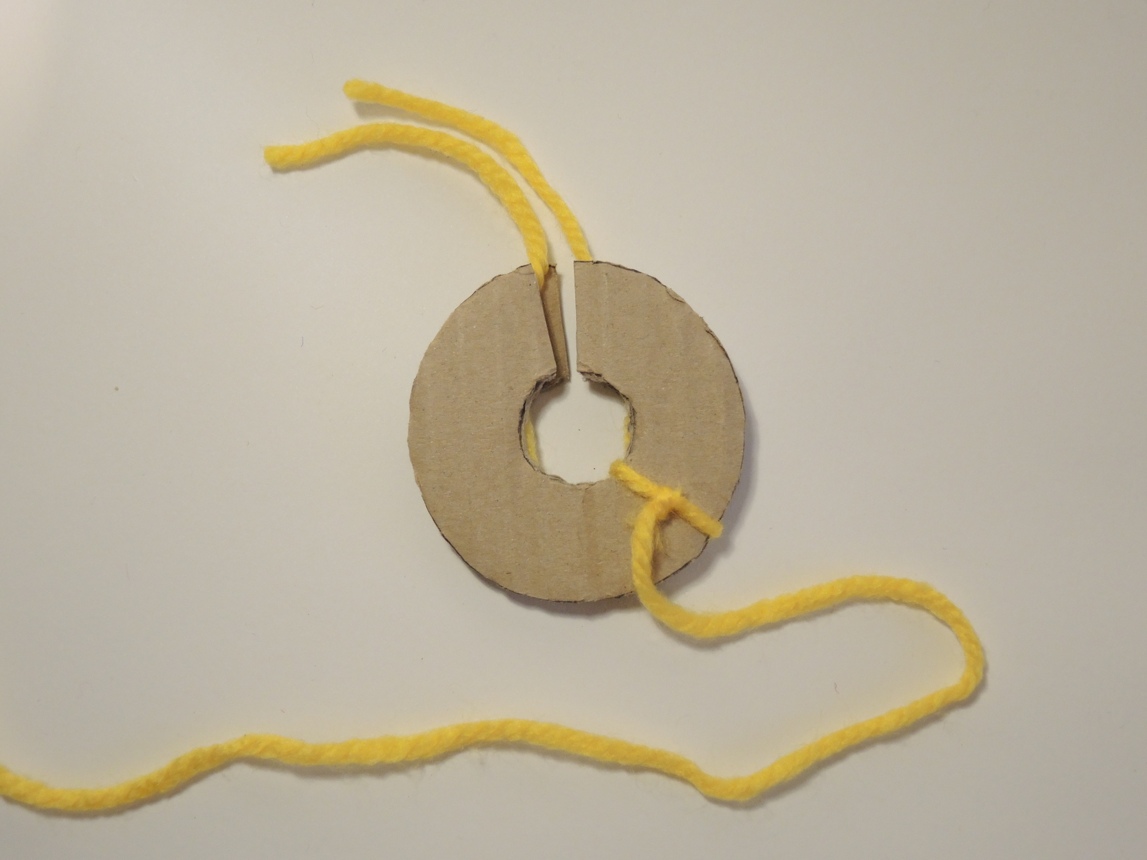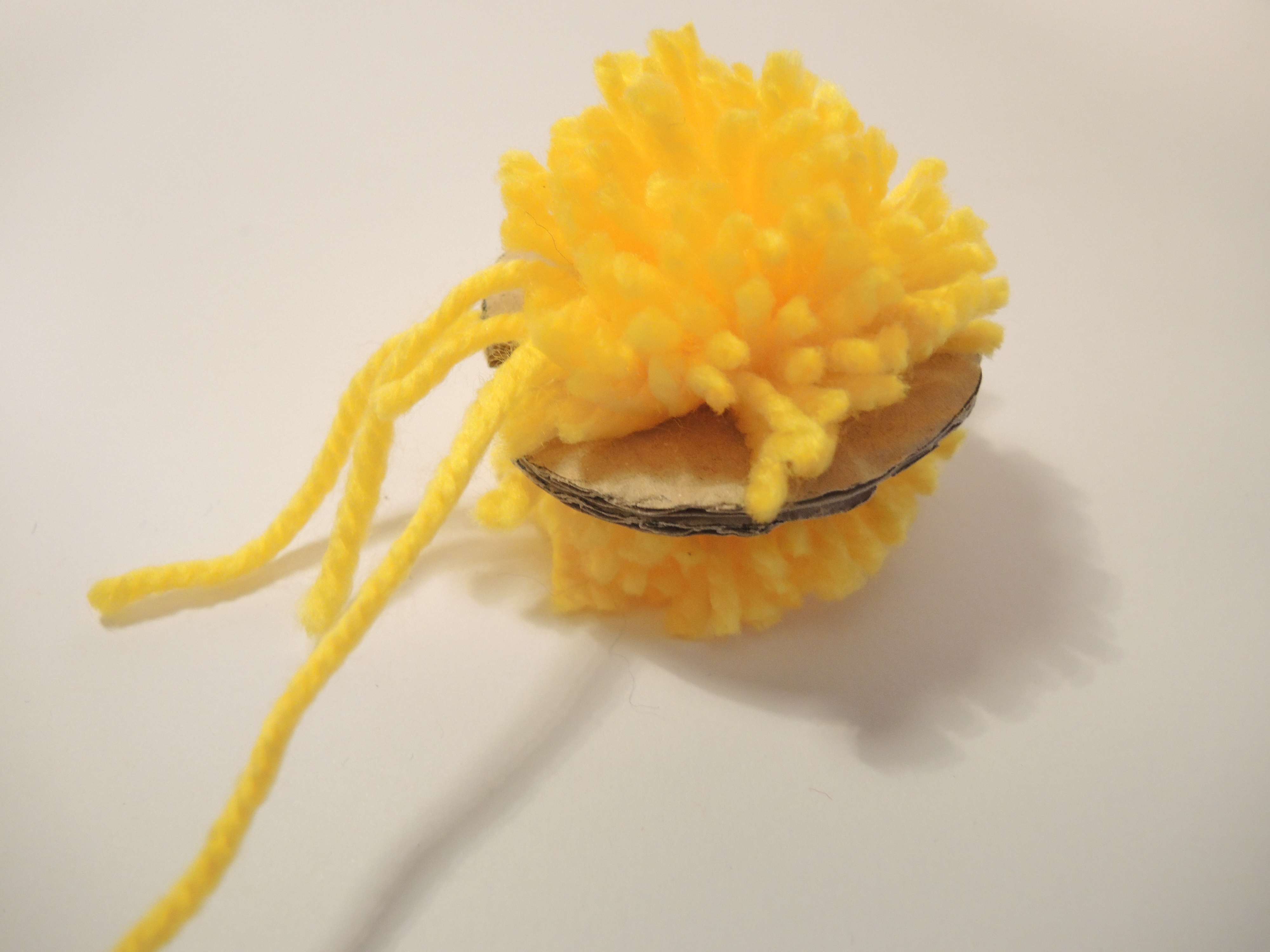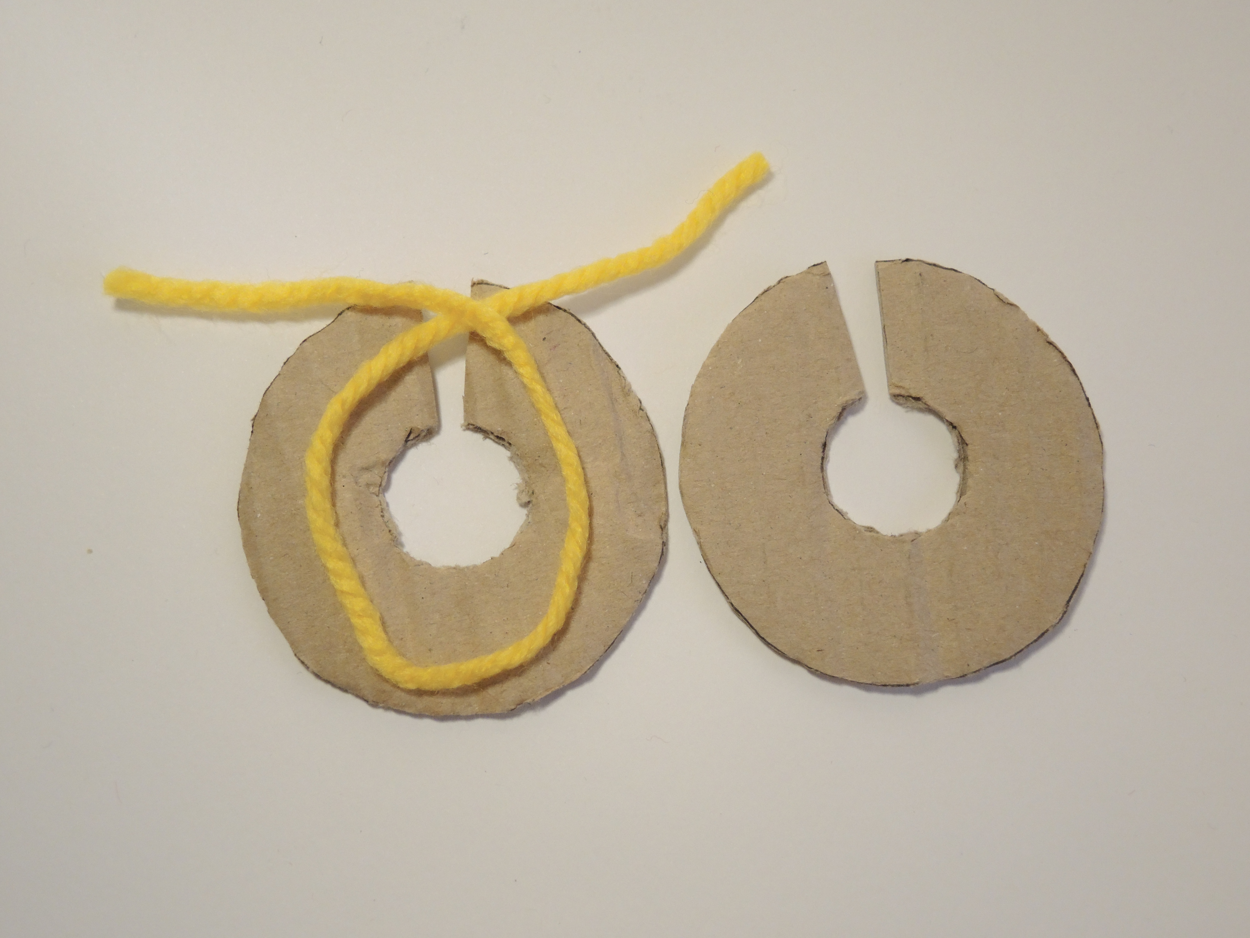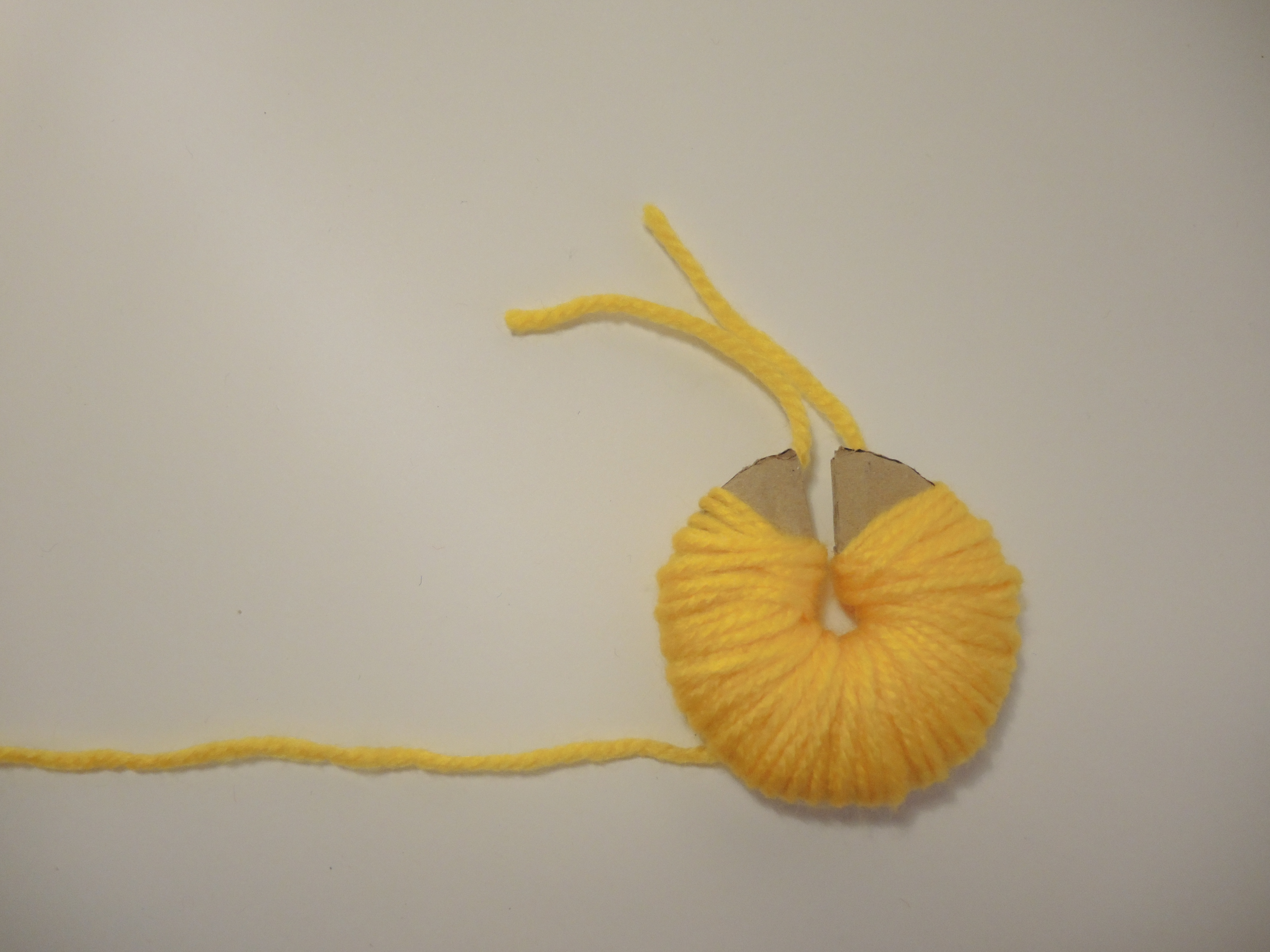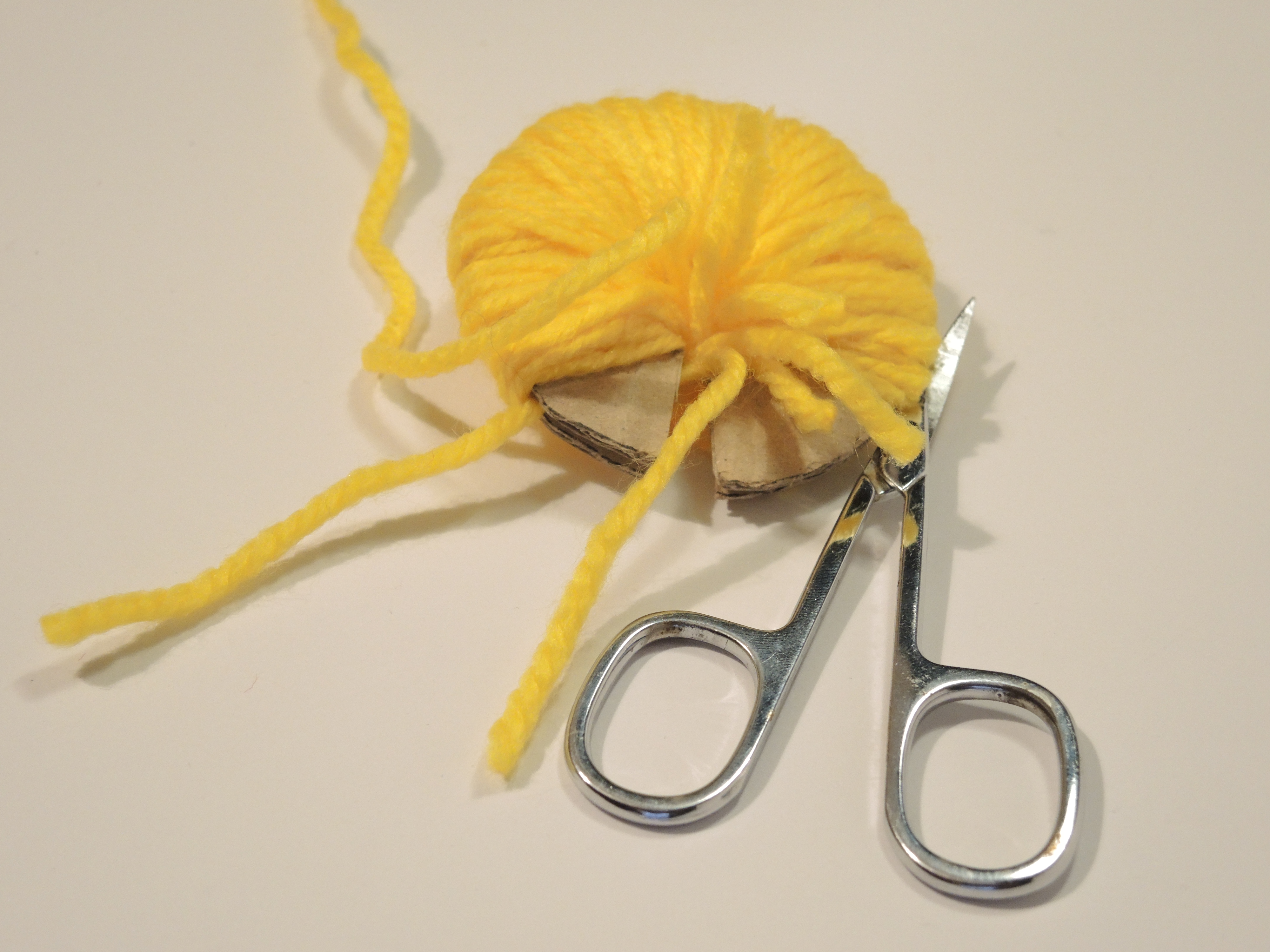 Inserendo la punta delle forbici nella fessura tra i due dischi di cartone, tagliare la lana. Una volta tagliata tutta la lana, stringere con forza il filo e fare un nodo. Togliere i due dischi di cartone.